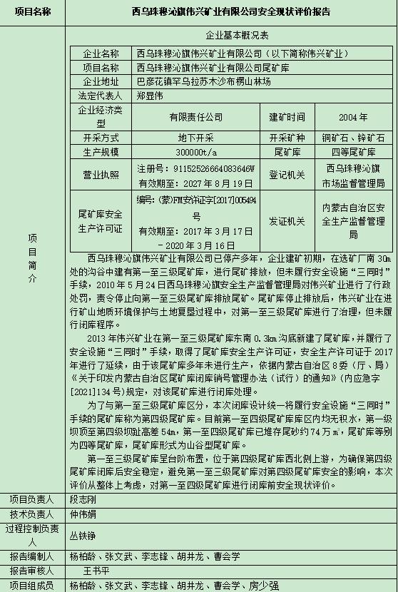 西烏珠穆沁旗偉興礦業有限公司安全現狀評價報告