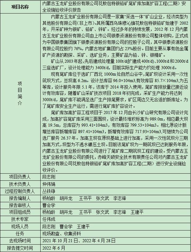 內蒙古玉龍礦業股份有限公司花敖包特銀鉛礦尾礦庫加高擴容工程(二期)安全設施驗收評價報告