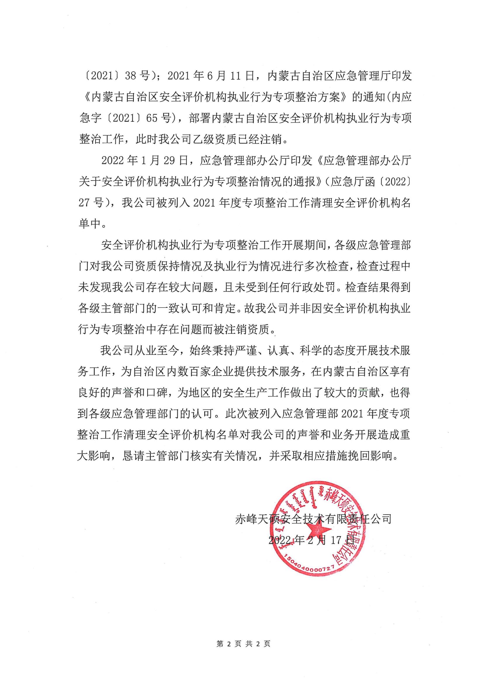2022年1月29日,應急管理部辦公廳印發《應急管理部辦公廳關於安全評價機構執業行為專項整治情況的通報》(應急廳函〔2022〕27號),我公司被列入2021nianduzhuanxiangzhengzhigongzuoqinglianquanpingjiajigoumingdanzhong。wenjianyinfahou,cishiyinqiduofangguanzhu,wogongsimuqianyewukaizhanyiqiezhengchang,ganxieshehuigejieduiwogongsideguanzhuyijiyizhiyilaidezhichi。現就相關情況作出如下說明。